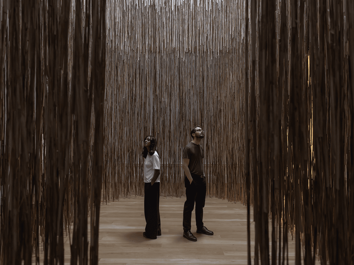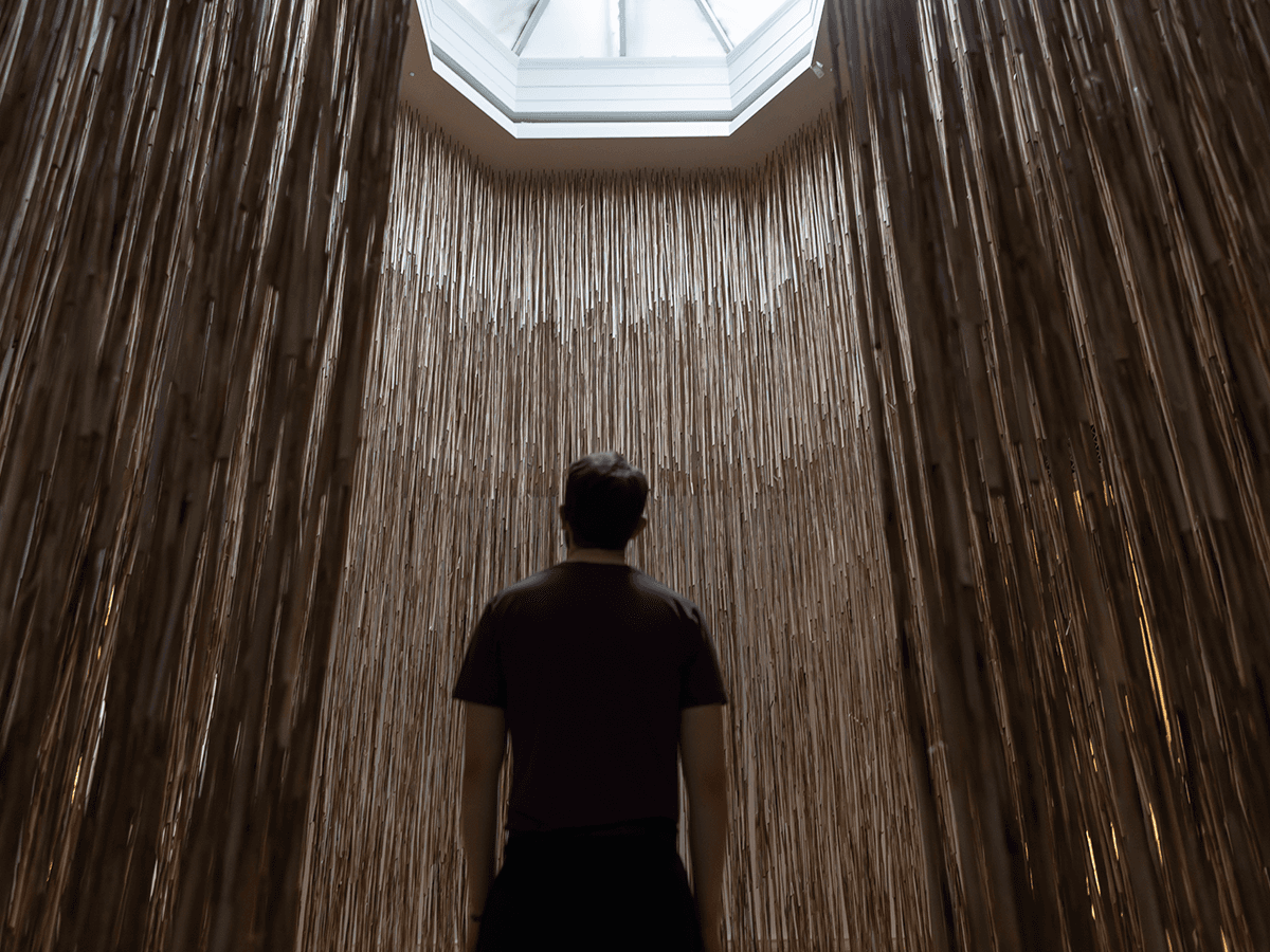 The “halo” structure, designed to suspend thousands of reeds from above, was carefully constructed to encircle the historic skylight while safely supporting the delicate installation.