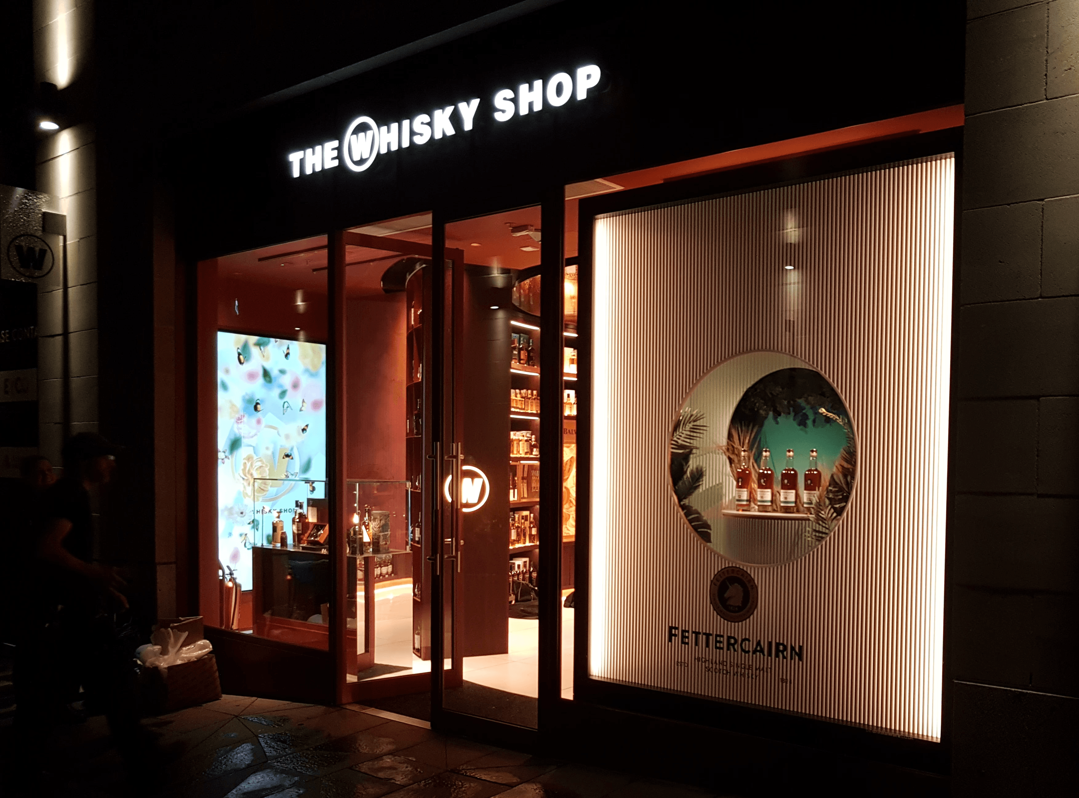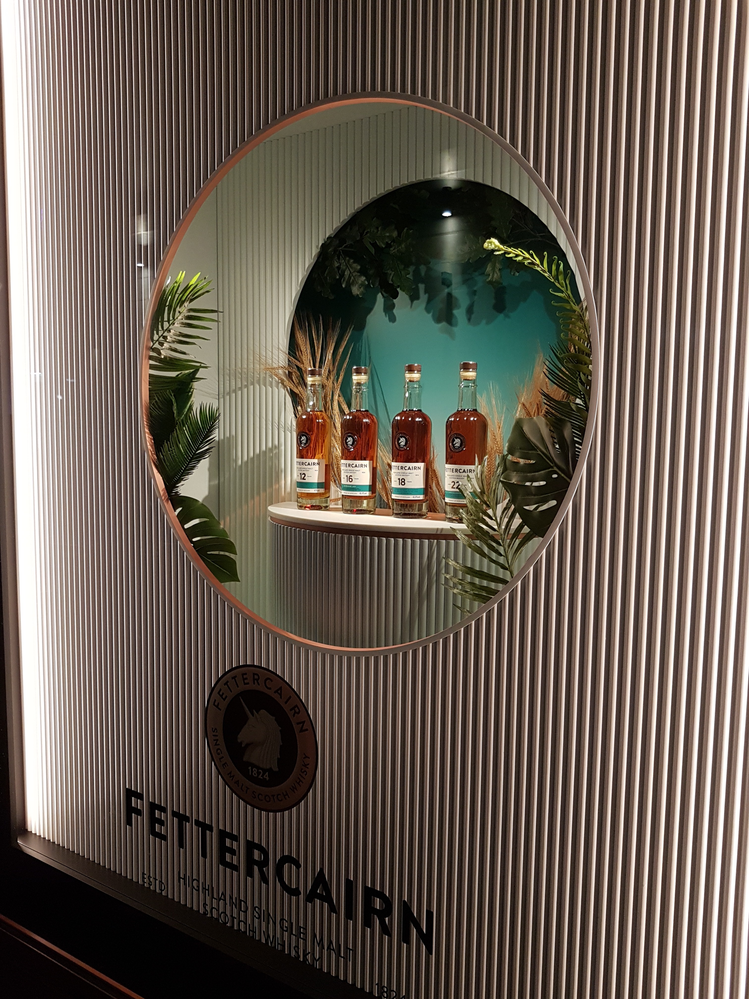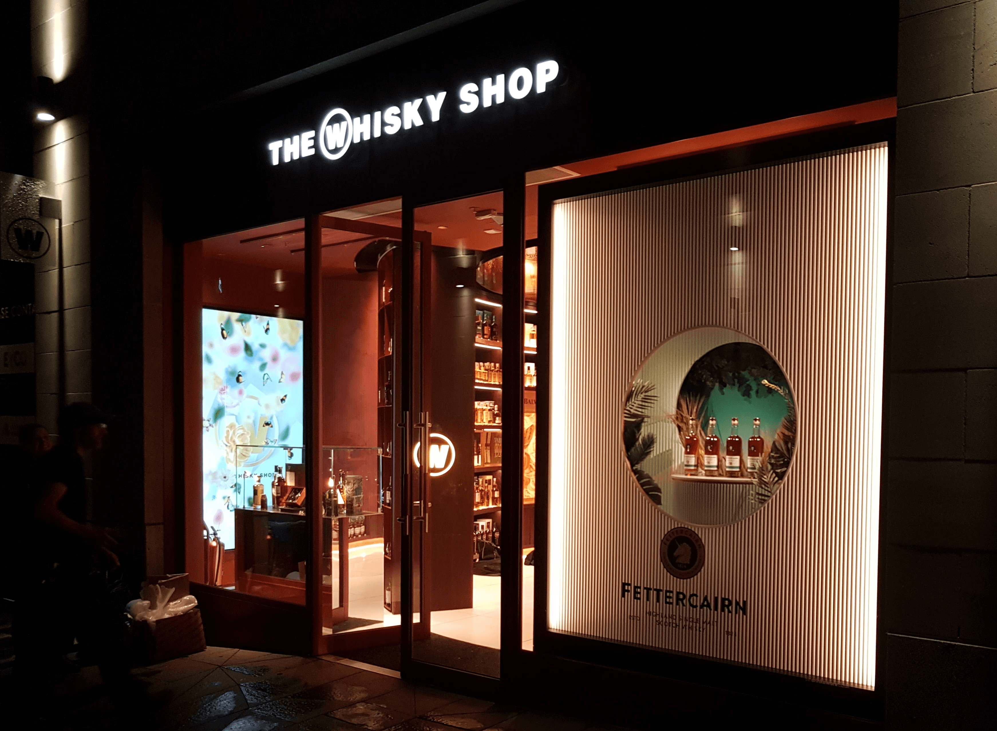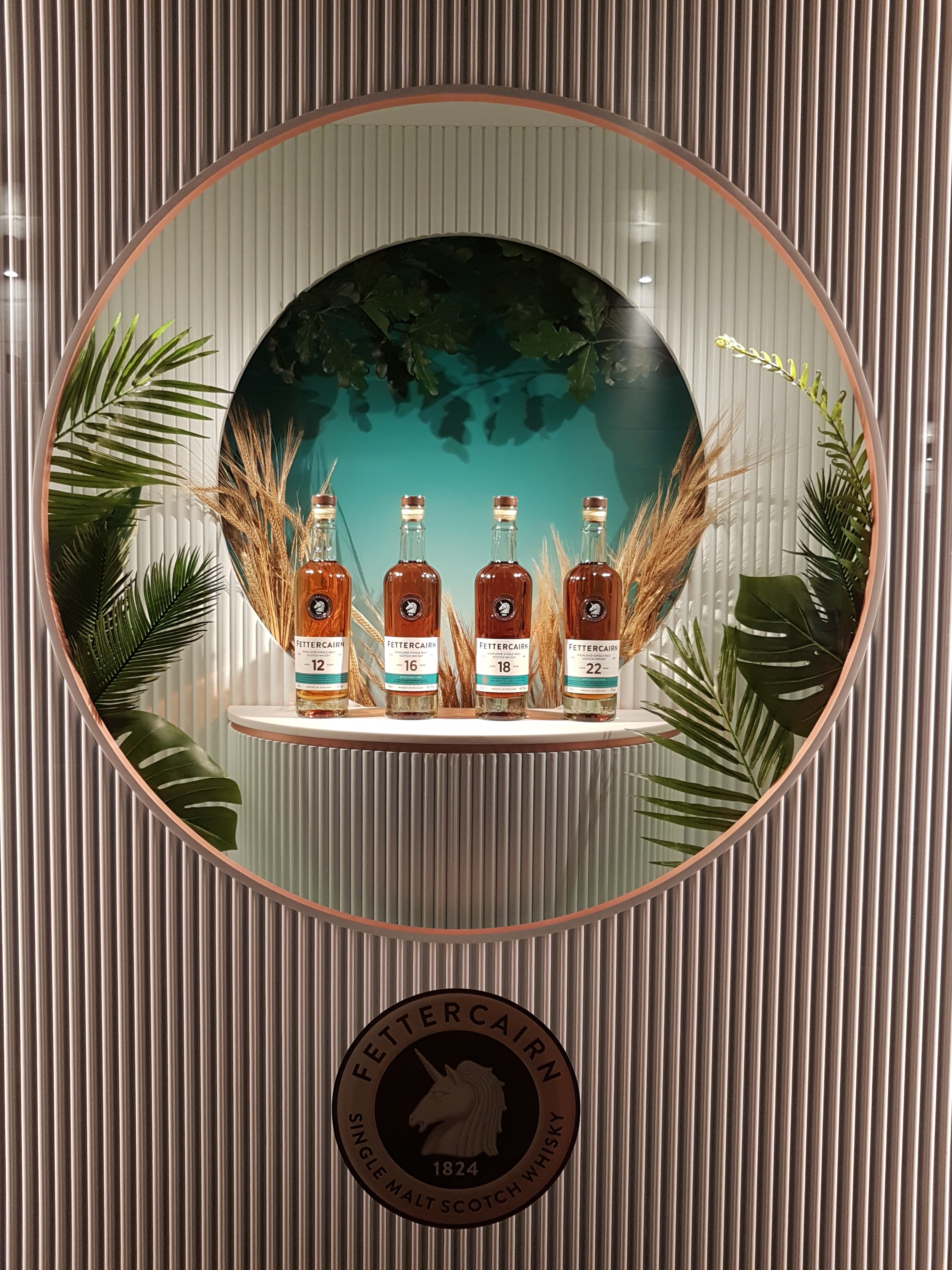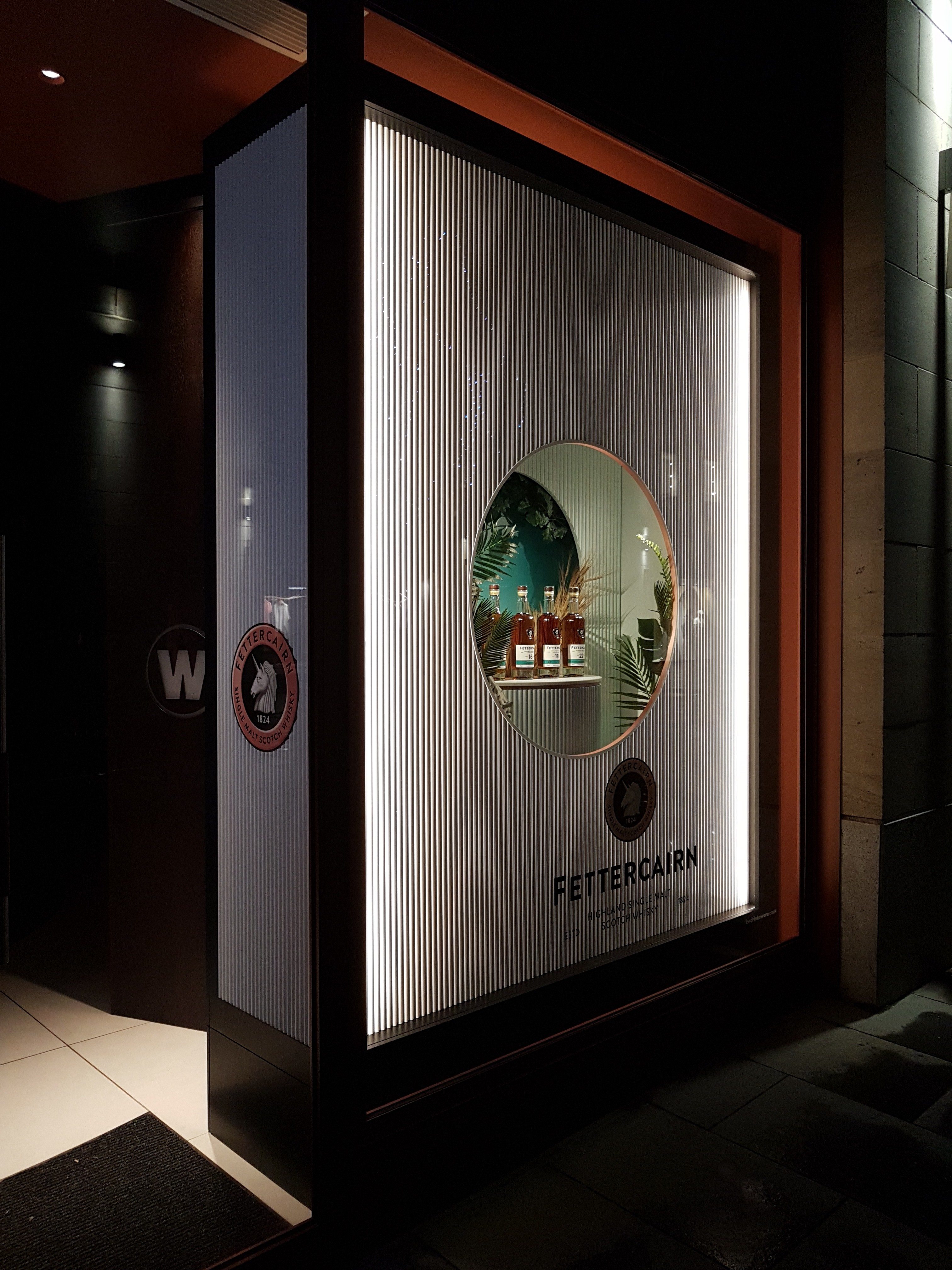 The addition of carefully selected foliage and directional lighting enhanced the design, making this whisky shop window display truly stand out.